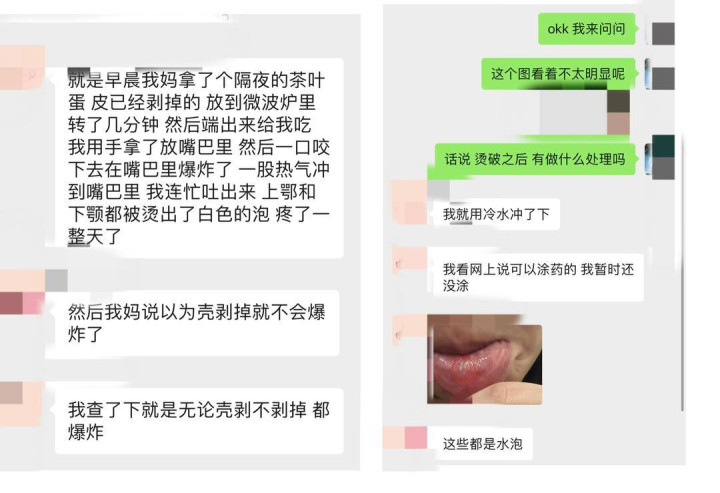 扬子晚报讯(记者王梦航)2月18日,市民张女士吃茶叶蛋,没想到一口咬下去却在嘴里“炸开”,热气将上下颚烫出水泡,疼了一天,“当时我妈在弄早饭,她把隔夜的茶叶蛋剥壳在微波炉里加热,我吃的时候没想到突然爆开,热气烫得受不了。”她告诉记者,妈妈还特地把鸡蛋薄膜剥去,没想到还是发生了糟心一幕。